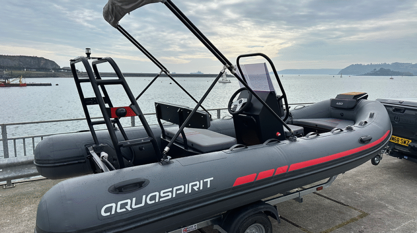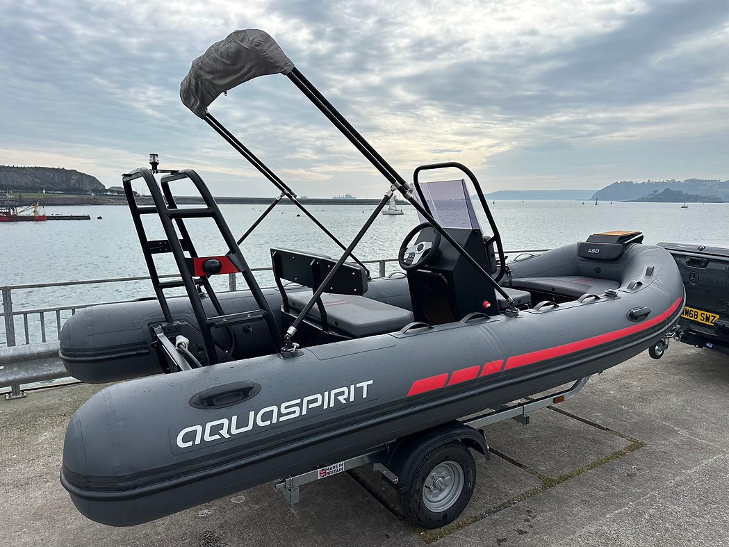 New Aquaspirit 450 with 40 hp Suzuki engine (optional 50/60hp upgrade). In stock in Plymouth. Cones with trailer and dust cover. Grey PVC tubes with red detailing. Sand colour Sea Deck soft decking, A frame with ski hook, removeable fuel tank, bimini, bathing ladder, cushions and black hull. 3 cleats and mooring eye. Console and seating. Navigation lights, bilge pump and bow step plate.